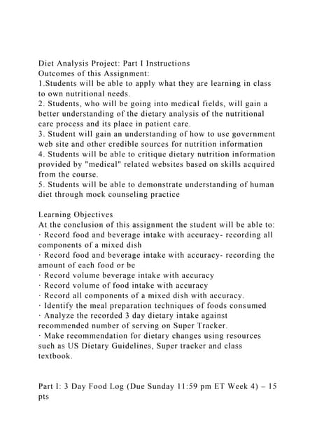 Diet Analysis Project Part I Instructionsoutcomes Of This Assig Docx